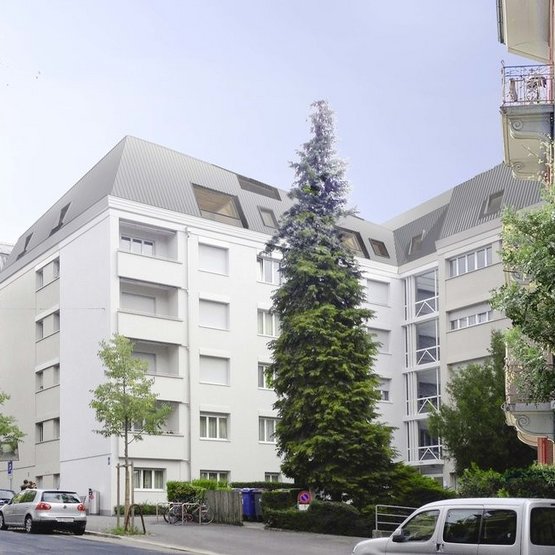 Ce charmant appartement mansardé, disposant de belles pièces de vie, est situé au dernier étage d'un immeuble moderne entouré de verdure.